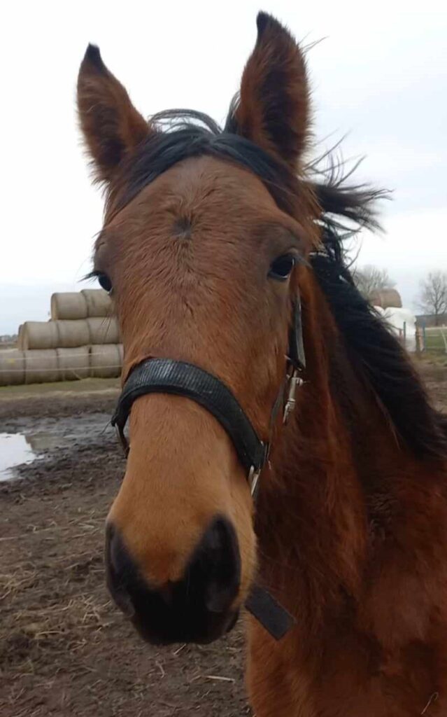 Mimo niełatwych warunków rozładunkowych – oblodzonego podłoża, Happy wyszła bardzo uważnie i stabilnie. W boksie zainteresowała się sianem i końmi dookoła.