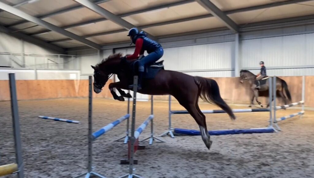 Kiedy ujeżdżeniowa strona mocy była stabilna i fajna, mogłyśmy zacząć coś rzeźbić przeszkodowo. Nie od razu było oczywistym, że one się rozskaczą ale odpowiednia liczba ćwiczeń i cierpliwe powtórki zrobiły swoje. To z czego jestem dumna to, że one naprawdę zrozumiały od czego jest przeszkoda… mimo że pierwsze próby skakania nie wyglądały ani trochę jak skakanie i musiałam naprawdę się nagimnastykować żeby przekonać Muchy do oddania skoku albo galopu po przeszkodzie. Tak teraz kiedy skakałam na nich robiąc ostatnie nagrania, miałam konie z uszami do przodu, całe chętne aby oddać skok i w dodatku myślące – czyli tak jak powinno być.