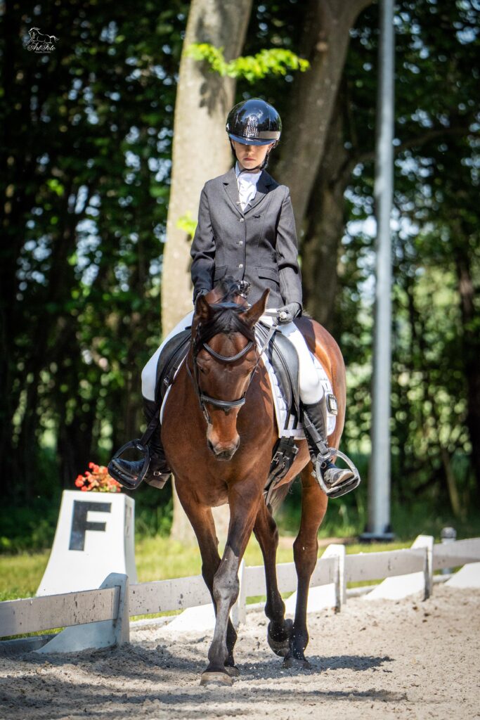 W sobotę startowałam w konkursie klasy P1. Było to drugie podejście Orkana do tej kategorii i bardzo cieszy mnie drugie miejsce oraz wynik 64,800%. Dodam, że Orek był najmniejszym konikiem w konkursie, a zdecydowana większość koni to były wysokie i potężne zwierzęta z ujeżdżeniowym papierem – widać to na zdjęciu jak jedziemy do dekoracji. Mimo to zaprezentował się pięknie i ani trochę nie odstawał, to jest bardzo waleczny koń, który zawody traktuje śmiertelnie poważnie.