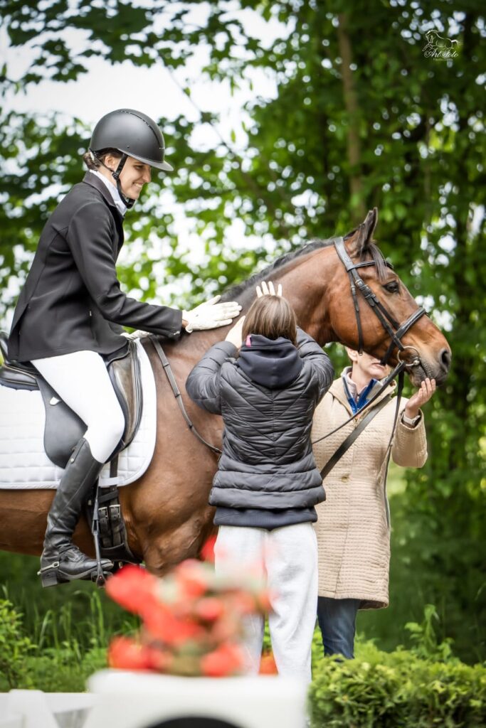 Orkan z dumnymi właścicielkami. Z każdym trenowanym przeze mnie koniem, wraz z jego właścicielami zwracamy szczególną uwagę na nagrody po dobrze wykonanych zadaniach. Zależy mi aby konie, które pięknie się dla mnie starają wiedziały, że otoczenie docenia ich wysiłki – to buduje u zwierząt wolę walki i frajdę ze startów.
