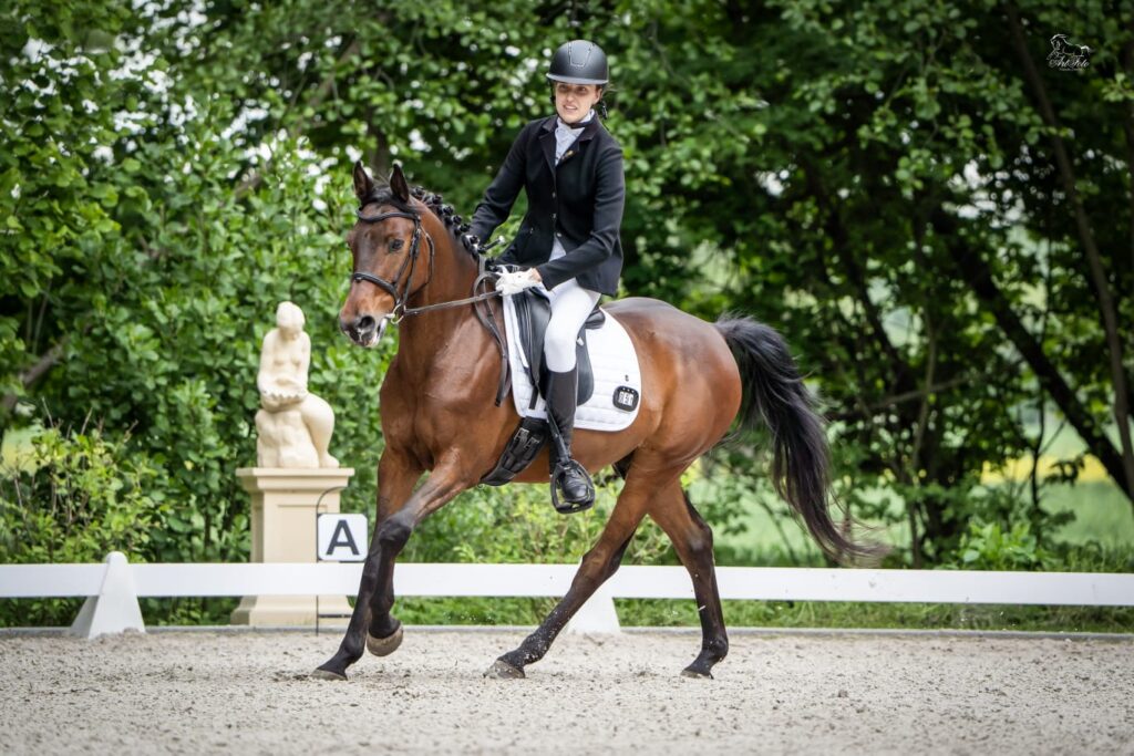 Dodatkowo, muszę napisać, że cieszą mnie dobre noty dokładnie w elementach, które chciałam poprawić od ostatnich startów. 7 za zatrzymanie, 7 za stęp pośredni po stępie swobodnym, świadczą o tym, że Orkan jest NAPRAWDĘ na pomocach i bardzo responsywnie odpowiada na stawiane mu zadania. Zagalopowania to specjalność tego konia – on po prostu wie że ma być okrąglutki i do góry (ale tutaj śmieszny fakt, bo kiedy zaczynałam go jeździć to WCALE tak nie było i początkowo duuuuuuużo czasu poświęcaliśmy właśnie wejściu w galop) Teraz mogę napisać, że Orkan naprawdę dobrze się ich nauczył. Zagalopowania idealnie w literce C w dobrym stylu zaowocowały oceną 7. Miłym zaskoczeniem było 7 w przejściu z galopu do kłusa – czułam z siodła że może być dobrze bo charakterystycznie mnie zakołysało od zadu i poczułam jak Orkan unosi front ciała nie gubiąc okrągłości. Sędziowie także to zauważyli, tą tendencję do bardziej tanecznego kłusa będziemy teraz rozwijać, żeby momenty z przejścia przenieść na ogólny charakter kłusa.