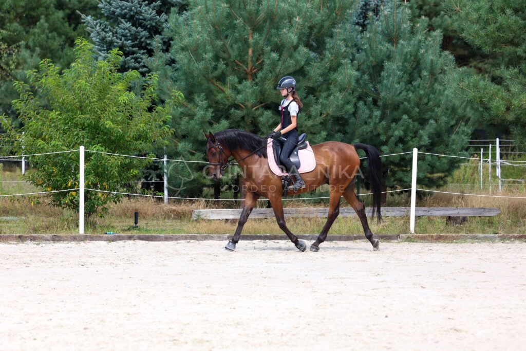 Napiszę krótko, byłam zachwycona. Ćwiczenia dobrane w punkt zarówno dla konia jak i dla jeźdźca. Idealnie pasujące do aktualnej sytuacji treningowej, celujące w poprowadzenie pary dalej na wyższy poziom. Skupialiśmy się nad wszystkim, czego Ania mogłaby potrzebować następnego dnia. Luis idealnie i niemalże bez słów zrozumiał, że robimy konia dla dziecka. Jeździłam pod metronom i rytm, żeby dostać maksymalną kompaktowość ze strony Orkana. Nikogo nie zdziwi chyba, że zrobiłam masę przejść, ze szczególnym naciskiem na małe kroczki oraz odpuszczenie i dążność do neutralnej postawy czyli klasyczne „just sit and release”. Dodatkowo wjazdy na linię środkową, po drugim śladzie i zatrzymania z cofaniem. Orkan dał z siebie 200%, dumnie i lekko kroczył i był cudownie skupiony na mnie, NIC poza mną go nie interesowało. Jeżdżąc starałam się po prostu maksymalnie wykorzystać ten treningowy czas i robić dokładnie to czego chce Luis, nie specjalnie zastanawiając się jak to wygląda z ziemi. Kiedy obejrzałam filmiki treningowe (niestety nie mogę ich wstawić, bo szkolenia rządzą się swoimi prawami) powiedziałam WOW. Naprawdę nie spodziewałam się tak równego miękkiego i okrągłego obrazka na CAŁKWICIE zamkniętym pyszczku. Orkan wiedział, że to TEN MOMENT i był wspaniały (chociaż początkowo nieco przejęty).