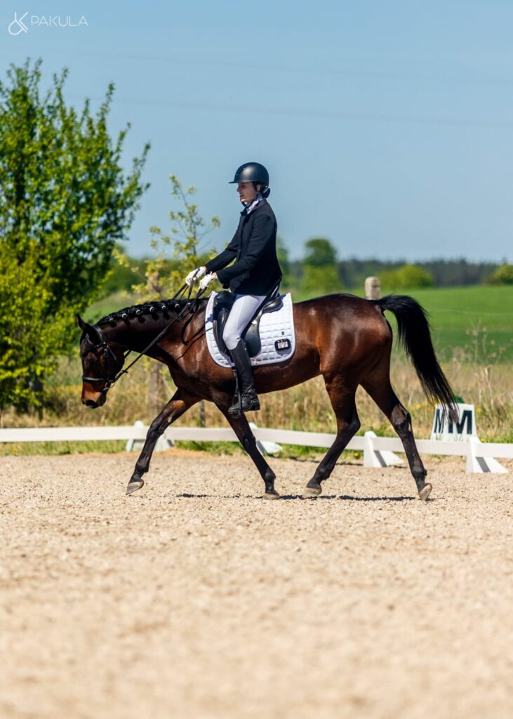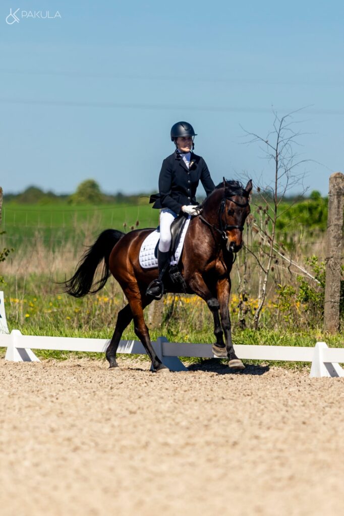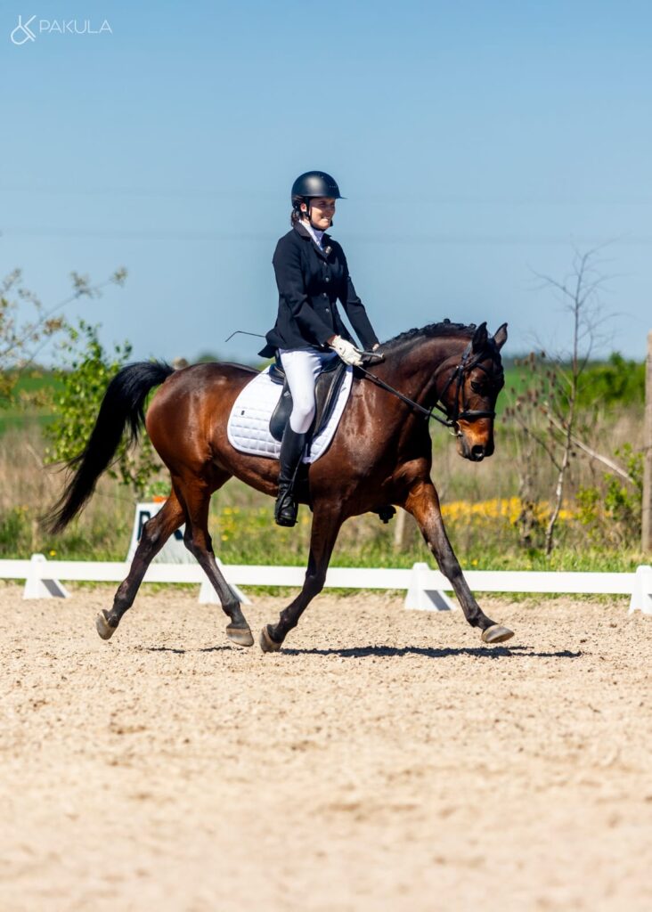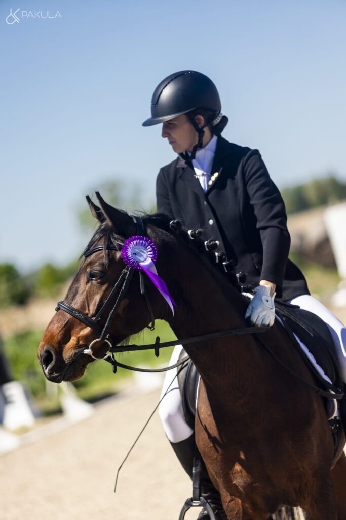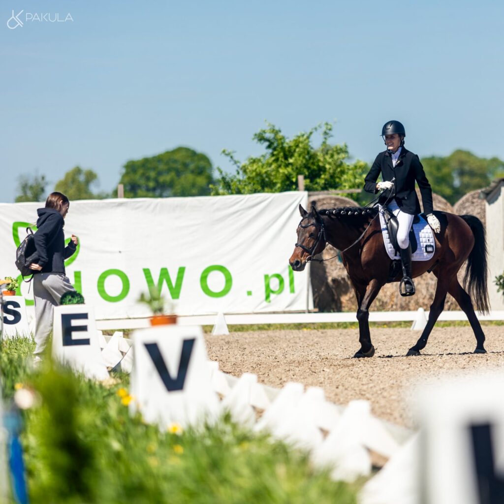 Startowy plan Konia Orkana udał się bardzo dobrze. Pierwszy dzień przyniósł co prawda błędy i chwile słabości. Okropny narożnik przy sędziach w prawo okazał się być BARDZO przerażający ale udało się go już bezkolizyjnie przejechać zarówno w drugim przejeździe jak i kolejnego dnia. Emocje ze strony konia były. Czułam że Orkan przeżywa dzwonek, publiczność, sędziów. Ale jednocześnie, co było super, z kroku na krok był pewniejszy, bardziej rozluźniony, zadaniowy. Mogłam sobie już pozwolić na lżejsze wskazówki, co jest moim głównym celem, bo jego amazonka jest młoda, więc także jej pomoce są delikatniejsze, na co go przygotowuję.